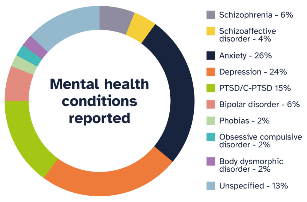 As shown in Figure 4, 50% of self-reported mental health conditions were identified as depression or anxiety.