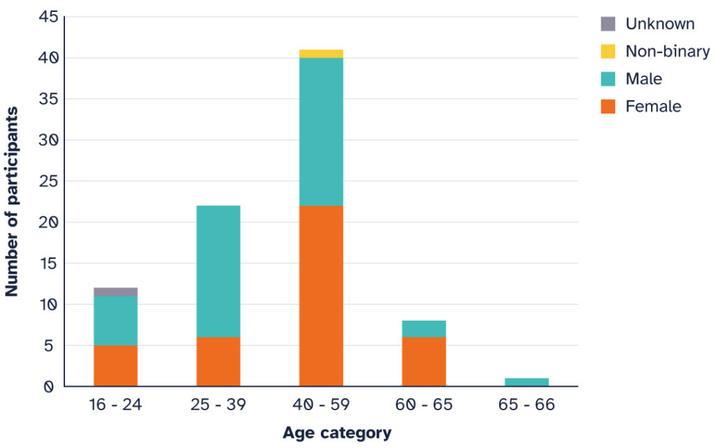 One individual took part in an interview and chose not to disclose demographic information; therefore, the total number of individuals reported in this graph is 84. Just under half of participants were aged 40-59 years old (48%), and 51% of participants reported being male.