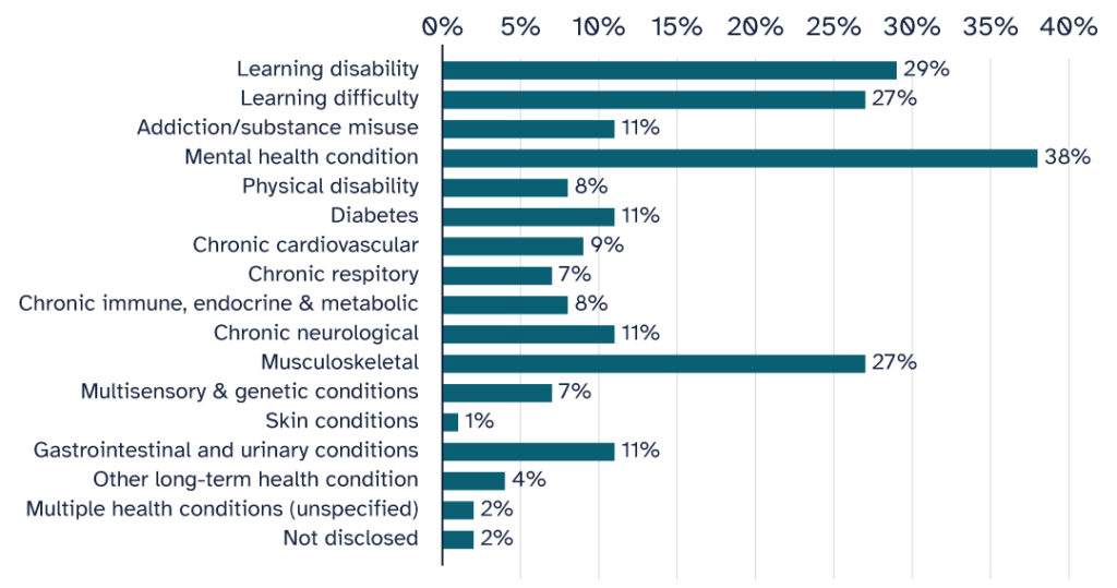 As shown in Figure 2, mental health conditions were most reported by participants (38%), followed by musculoskeletal conditions (27%), learning disabilities (29%) and learning difficulties (27%). The distributions may be skewed due to our intentional recruitment of participants from specific support organisations. Notably, while the prevalence of mental health conditions, learning disabilities, and learning difficulties in our sample exceeds national averages, the self-reported rate of musculoskeletal (MSK) conditions aligns closely with national figures.